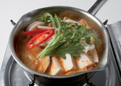 6. 두부, 팽이버섯, 쑥갓, 고구마, 붉은 고추를 넣고 끓여 마무리한다.