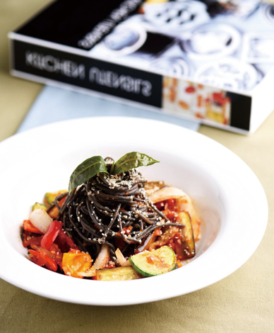 홀토마토 200g, 토마토 100g, 다진양파 30g, 다진마늘 20g, 먹물파스타 25g, 치즈 25g