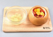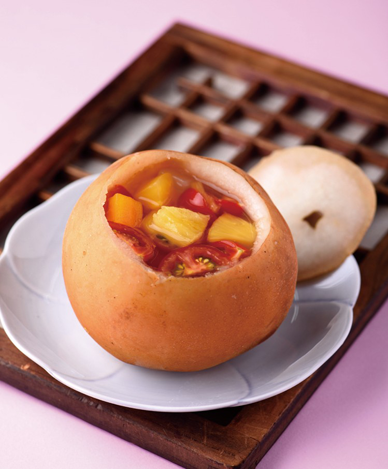 3. 방울토마토를 먹기 좋게 잘라준 후 속을 파낸 배에 후르츠 칵테일과 방울토마토를 넣어준다.