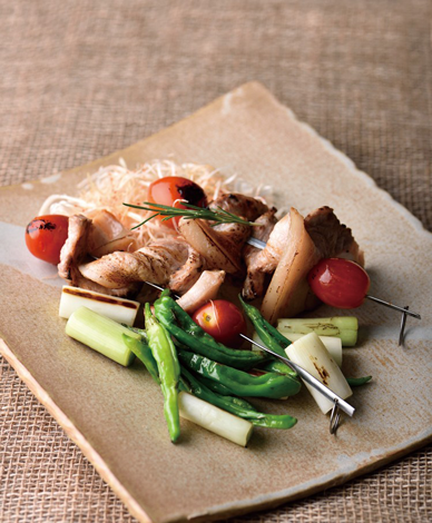 5. 삼겹살을 꼬치에 끼워 굽고 구워진 채소, 대파채와 함께 완성한다.