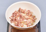 2. 베이컨을 한 번 데쳐내 송송 썰어준 후 다진 마늘과 볶아준다.