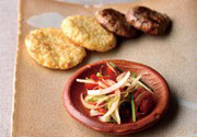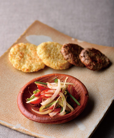 6. 접시에 토마토 겉절이를 담고 라이스버거와 떡갈비를 올려 완성한다.