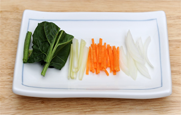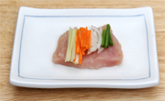 2. 시금치는 살짝 데쳐 썰고, 당근, 양파, 샐러리, 파프리카는 약 6Cm 길이로 채를 썰어 절반은 닭고기말이에 사용 하고, 절반은 곁들임채소로 사용한다.