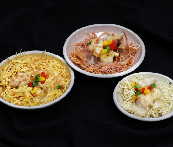5. 녹말가루를 묻힌 닭고기살도 튀김 기름에 튀겨 기름을 빼 놓은 둥지국수 위에 올린다.