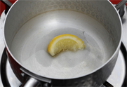 6. 냄비에 레몬과 설탕을 넣고 물을 넣어 끓이다가 레몬은 건져 내고, 마늘과 생강, 연유, 식초, 녹말을 풀어 넣고 살짝 한 번 더 끓여 녹말소스를 만들어, 튀겨진 닭고기 위에 올려 완성한다.