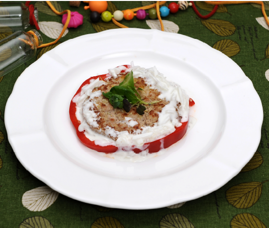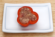 4. 속을 파낸 파프리카에 양념한 고기를 넣고, 꼭꼭 눌러 두툼하게 잘라 구워 접시에 담는다.