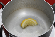 5. 냄비에 레몬을 넣고, 물을 넣고 은근히 끓인다.