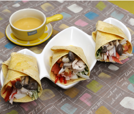 6. 또띠아를 팬에 기름 없이 굽고, 그 안에 닭고기 살과 느타리버섯, 오이, 사과, 파프리카와 호박을 넣어 속이 보이도록 말아놓고, ④번과 ⑤번은 섞어서 소스를 만들어 완성한다.