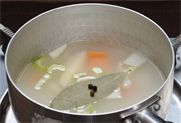 6. 거품을 걷어내고, 월계수 잎과 통후추, 통마늘을 넣고 끓이다가 연어와 생크림을 넣어 한 소큼 끓으면 완성한다.