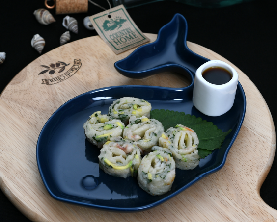 5. 밀가루에 찹쌀가루, 애호박, 깻잎, 대추채와 다진 새우, 오징어를 넣고 팬에 기름을 둘러 전병을 만든 뒤 돌돌 말아 썰어 접시에 담는다.