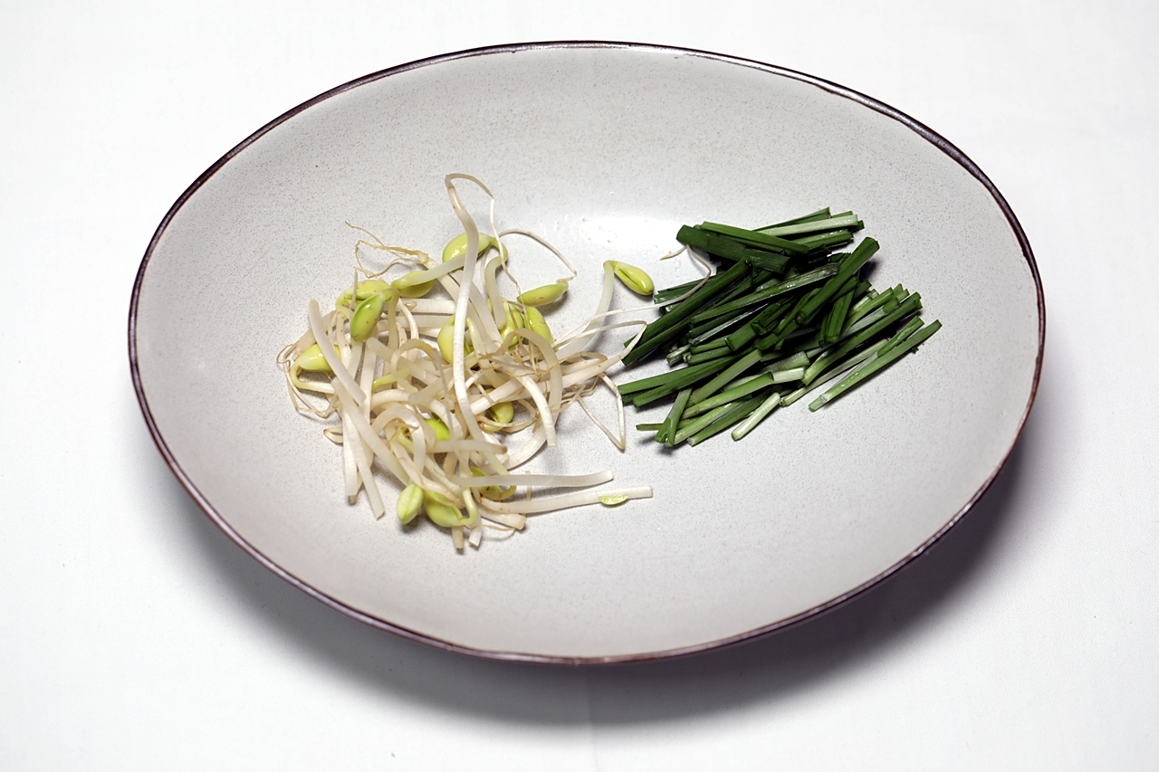 5. 된장이 끓는 동안 부추를 3cm 길이로 썰고 콩나물은 아삭하게 찐다.