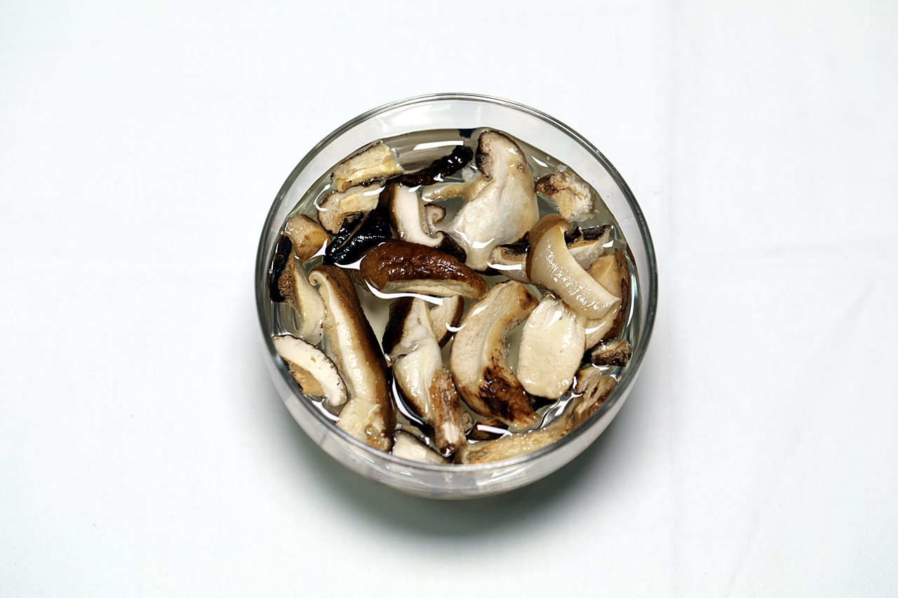 2. 표고버섯을 물에 담가 불리고 버섯 불린 물은 따로 받아둔다.