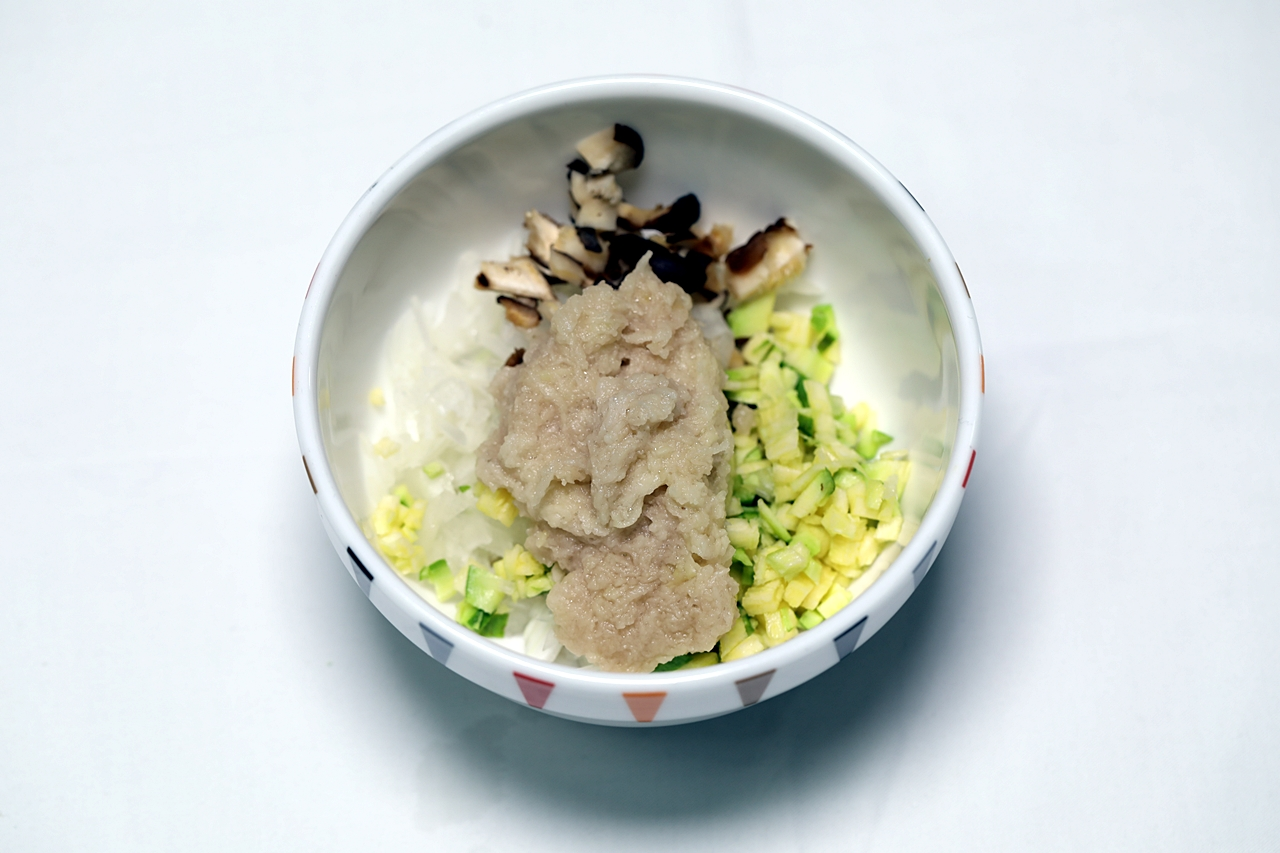 3. 불린 표고버섯, 양파, 고추, 애호박을 다지고 감자는 강판에 간다.