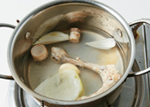 육수 닭뼈(90g), 양파(10g), 양송이버섯 밑동(5g), 마늘(5g)