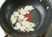 5. 마늘은 편 썰어 낮은 온도의 식용유에서 바삭하게 튀긴다.