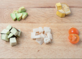2. 아보카도, 바나나, 가지, 연근은 깍둑 썰고, 방울토마토는 반을 가른다.