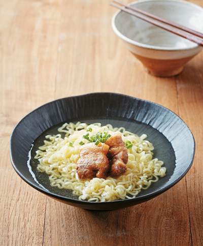 5. 육수를 뜨겁게 끓인 뒤 그릇에 라면사리와 함께 담고, 돼지고기조림, 쪽파를 올리고 팬에 남은 조림 소스를 끼얹어 마무리한다.