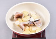 5. 코다리를 볶은 냄비에 무, 감자, 국물 재료를 넣고 충분히 끓인다.