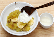 3. 으깨진 고구마에 바나나를 썰어 요거트와 함께 넣는다.