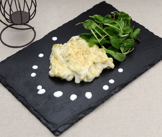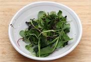 6. 어린잎은 물에 담그어, 건져 물기를 제거해 놓고, 으깬 고구마에 다진 잣을 넣어 샐러드를 완성한다.