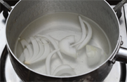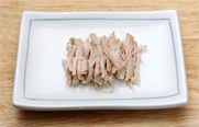 2. 냄비에 물을 1/3쯤 넣고, 양파채를 썰어 넣어 끓으면, 숙성된 닭고기살을 넣고 약 20분 정도 삶아 건진다.