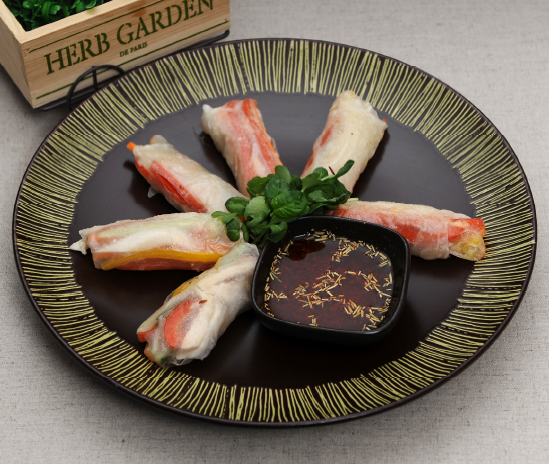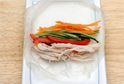 6. 건져 놓은 라이스페이퍼에 준비한 닭고기살과 파프리카, 오이, 당근 넣고 돌돌 말아, 녹말가루를 살짝 입혀, 팬에 굴리듯 익혀 완성하고, 준비해 놓은 소스와 함께 제공한다.