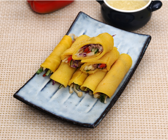 6. 팬에 올리브 오일을 바르고, 만들어 놓은 단호박 반죽을 한 국자씩 떠 넣어, 밀전병을 만들고, 밀전병이 익으면, 한 김 식혀, 그 안에 소고기 볶음과 채소를 넣어 돌돌 말아 소스와 함께 완성한다.