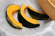 1. 단호박은 1/8 등분으로 갈라 속을 파내고 찜통에서 약 15~20분 정도 충분히 쪄낸다.