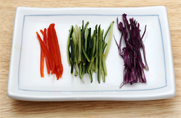 3. 파프리카와 오이, 적양배추는 채를 썰고, 무순은 물에 잠시 담그어 놓고, 사과는 채를 썰어 설탕물에 잠시 담그어 놓고, 팽이버섯은 밑둥만 잘라 한 줌 집기 좋은 크기로 준비해 놓는다.