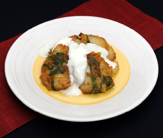 6. 마요네즈와 요구르트, 설탕, 식초를 넣어 골고루 섞어 튀김소스를 만들고, 튀김을 접시에 담아 양상추와 함께 얹어 완성한다.