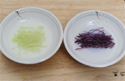 3. 현미쌀은 물에 충분히 불려, 물기를 빼 놓고, 양배추와 적 양배추는 곱게 채를 썰어 각각 찬물에 담그어 싱싱 해 지면 건져 물기를 빼놓는다.