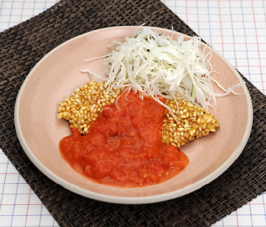 6. 숙성된 닭가슴살(①)에 튀긴 현미쌀 (⑤)을 앞뒤로 골고루 바르고 다시 170℃ 온도의 튀김 기름에 약 3~5분 정도 튀겨내고, 양배추와 적채를 깔고 그 위에 튀겨진 닭가슴살을 올리고, 토마토소스를 뿌려 완성한다.