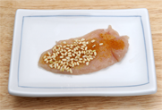 1. 닭가슴살에 칼을 1/3 쯤 넣고 양쪽으로 포를 뜨고, 정종을 살짝 발라놓는다.