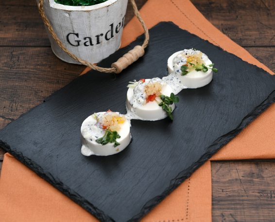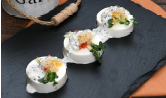 6. 접시에 드레싱, 연두부, 파프리카, 무순, 날치알 순으로 올린다.