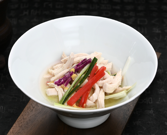 6. 차갑게 걸러 놓은 닭 육수에 발효된 겨자와 소금 .설탕, 식초를 넣어 육수 간을 하고, 그릇에 닭살과 오이 적채, 파프리카 양파를 올려 차가운 육수를 넣어 완성한다.