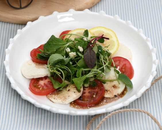 6. 두부와 준비한 토마토를 접시에 돌려 담고 어린잎을 위에 올린 뒤 먹기 직전에 발사믹소스와 파마산치즈를 뿌려 완성한다.