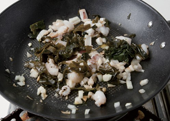 4. 미역을 넣고 볶다가 손질해둔 오징어, 주꾸미, 새우살, 양파를 넣어 볶는다.