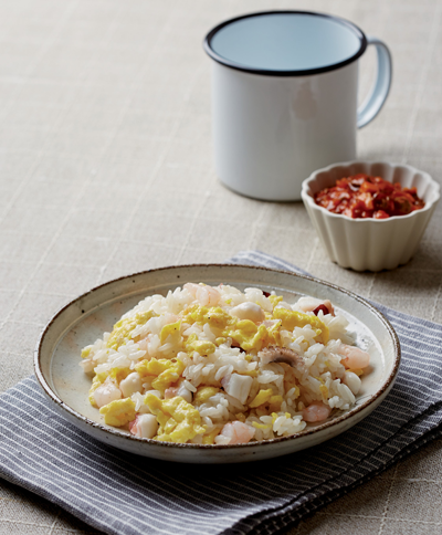 5. 식용유(15g)를 두른 팬을 중간 불로 달궈 밥을 넣어 볶다가 문어, 새우살, 주꾸미, 스크램블 에그를 넣고 조금 더 볶는다.