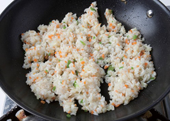 3. 팬에 식용유(15g)를 두른 뒤 잘게 다진 감자, 양파, 당근, 피망을 넣고 볶다가 밥을 넣고 같이 볶는다.