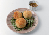6. 연어주먹밥튀김을 담고 어린잎채소를 곁들인 뒤 오리엔탈소스를 곁들여 마무리한다.