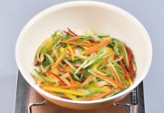 5. 오이는 돌려깎기 해서 채 썰어주고 청고추, 2가지색 파프리카, 당근도 채 썰어 각각 볶아 준다.