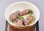 4. 편으로 썰어준 소고기에 채 썰어준 채소와 함초를 꼭 싸 말아준다.