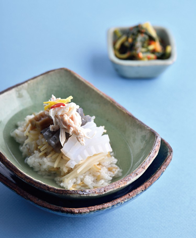 6. 그릇에 밥을 담고 콩나물을 올리고 3종류의 묵을 올린 후 계란으로 고명해 완성한다.