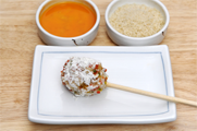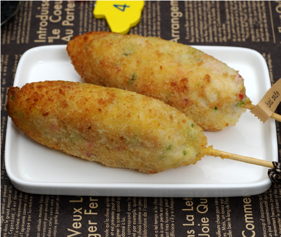 6. 막대기에 밀가루를 살짝 바르고, 소시 지에 반죽(⑤)을 감싸듯 손으로 둥글게 말아 밀가루와, 달걀물, 빵가루 순서로 입혀 튀김 기름 170℃의 온도에서 약 2분 정도 튀긴 후 기름을 제거하여 완성한다.