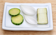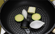 2. 애호박은 동그랗게 자르고, 양파는 형태 그대로 떼어내고, 가지는 직사각형으로 잘라 준비한다.