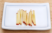 4. 사과는 껍질을 깨끗이 씻어 길쭉하게 썰어놓는다.