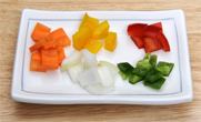 3. 파프리카와 토마토는 속씨를 제거하고 사각으로 썰고, 당근, 양파, 표고버섯도 사각지게 썰어 준비한다.