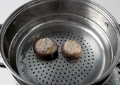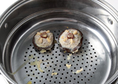 2. 표고버섯은 밑동을 제거한 뒤 안쪽에 밀가루→달걀물 순서로 바른 뒤 반죽을 넣고 달걀물을 한 번 더 발라준 뒤 김 오른 찜기에 15분간 찐다.