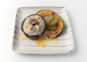6. 쇠고기표고찜에 오렌지소스를 뿌리고 피클과 구운 단호박을 곁들여 마무리한다.
