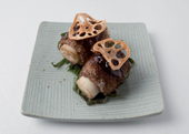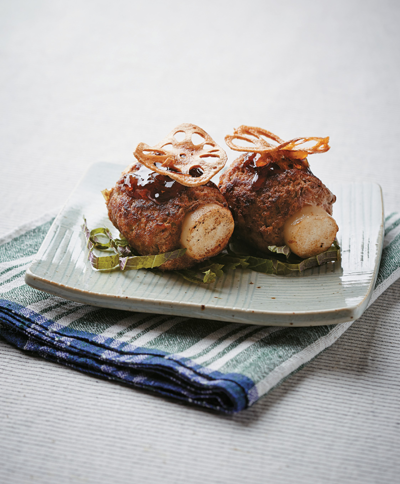 6. 떡갈비에 유자소스를 바르고 연근칩을 올려 마무리한다.